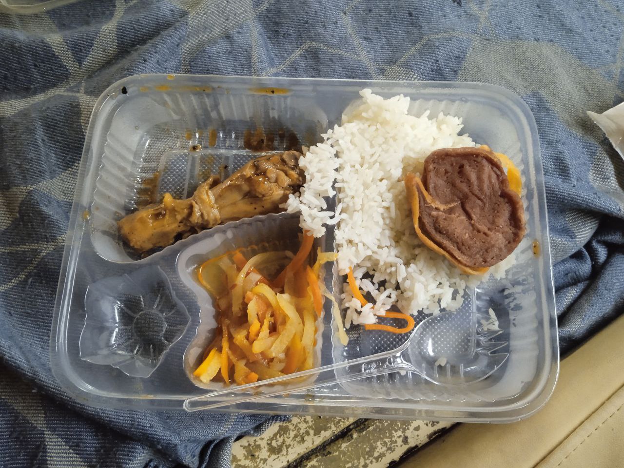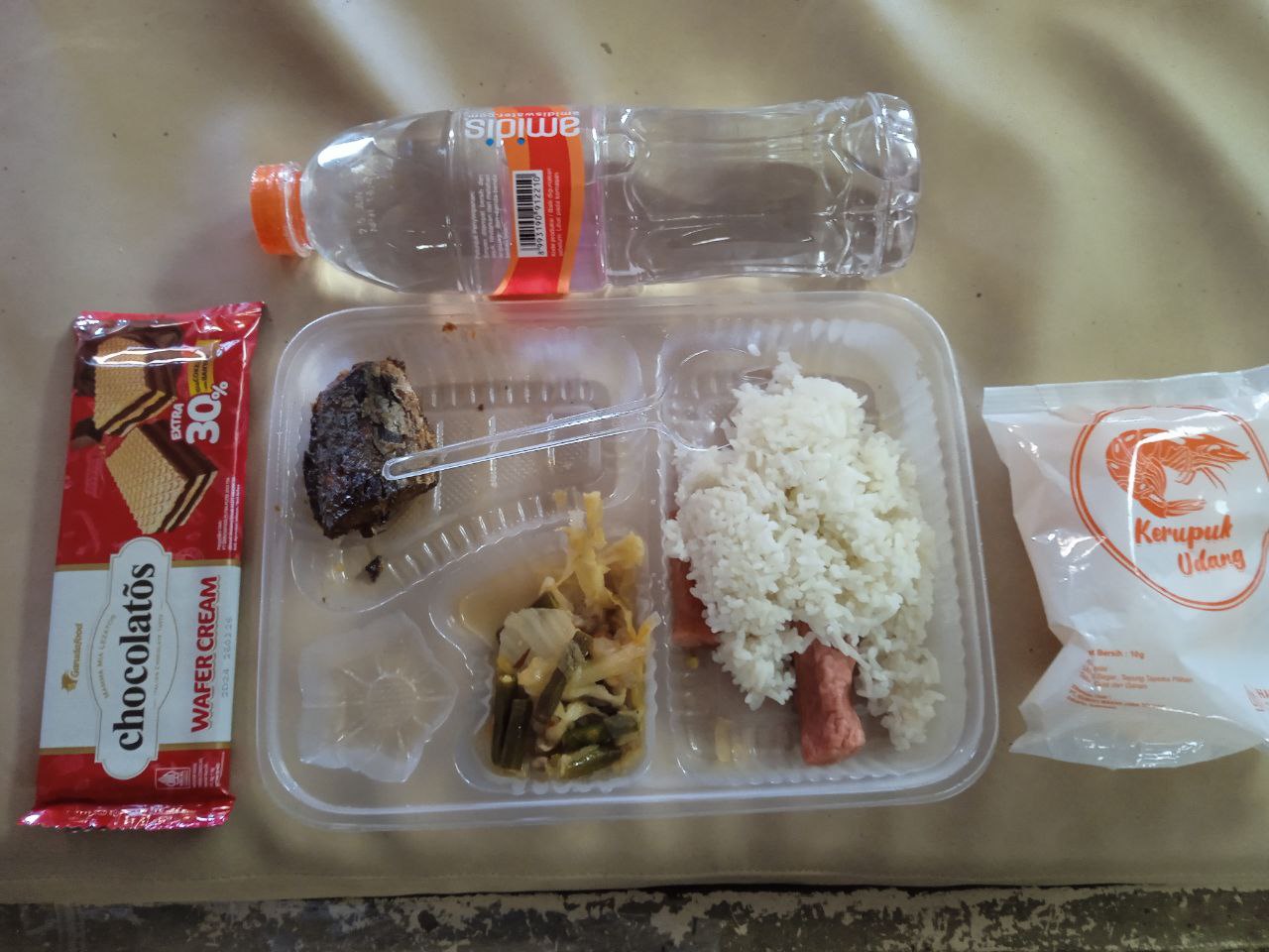 Pukul 19:00, kapal berangkat menuju Makassar, tujuan saya. Menu makan malam di hari kedua adalah nasi putih dengan ayam lada hitam (lagi), sayur tumis, dan daging giling(?), beserta air mineral.